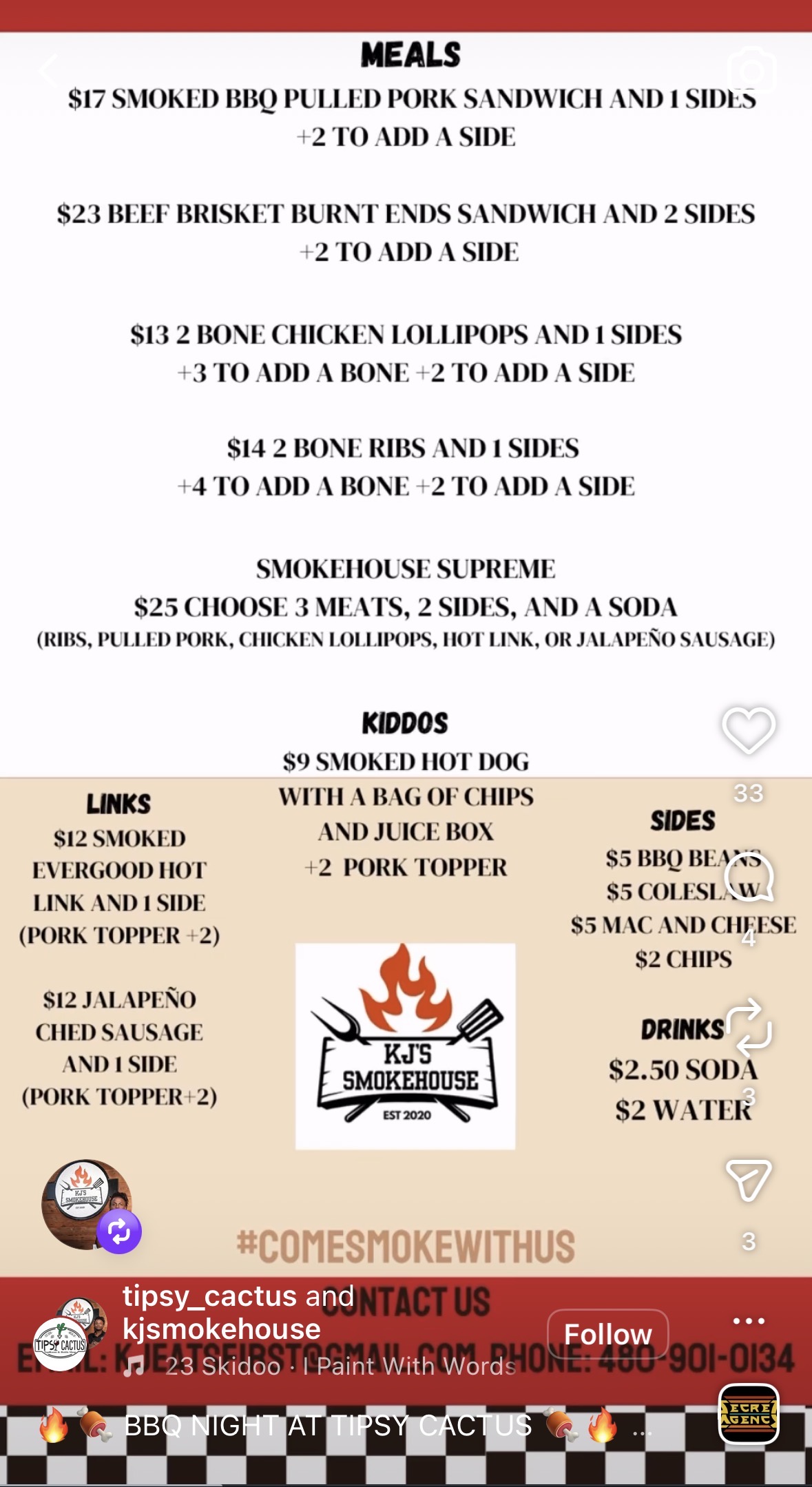 Get your Pulled Pork Sandwiches, Brisket Burnt Ends, Chicken Lollipops, and of course your BONE RIBS! Grub all the delishes sides and check out the kids menu!